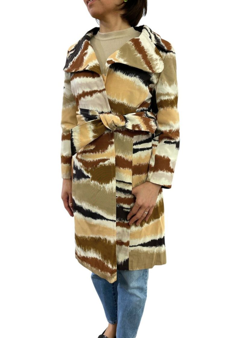 軽やかな素材感で、秋や春など季節の狭間に活躍するコンパクトな1枚。 共布の太めベルトをぎゅっと結べば、ウエストがキュッと引き締まり、シルエットにニュアンスを加えてくれます。 ヴィンテージならではの風合いと、今の空気感を併せ持った、まさに一点モノの主役級アウターです。デニムやスラックス、ワンピースに羽織るだけで、旬なレトロモダンスタイルが完成。