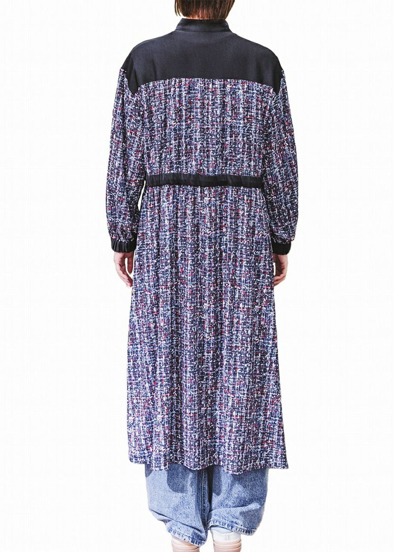 ライダースのようなデザインは、サテン素材で上品に仕立てられたハンサムワンピース。程よい肉感のあるジョーゼット素材にツィード柄をプリント。しなやかでドレープ性がありシワになりにくく、自宅で洗濯できるのも◎。羽織としても使えるジップアップワンピース。