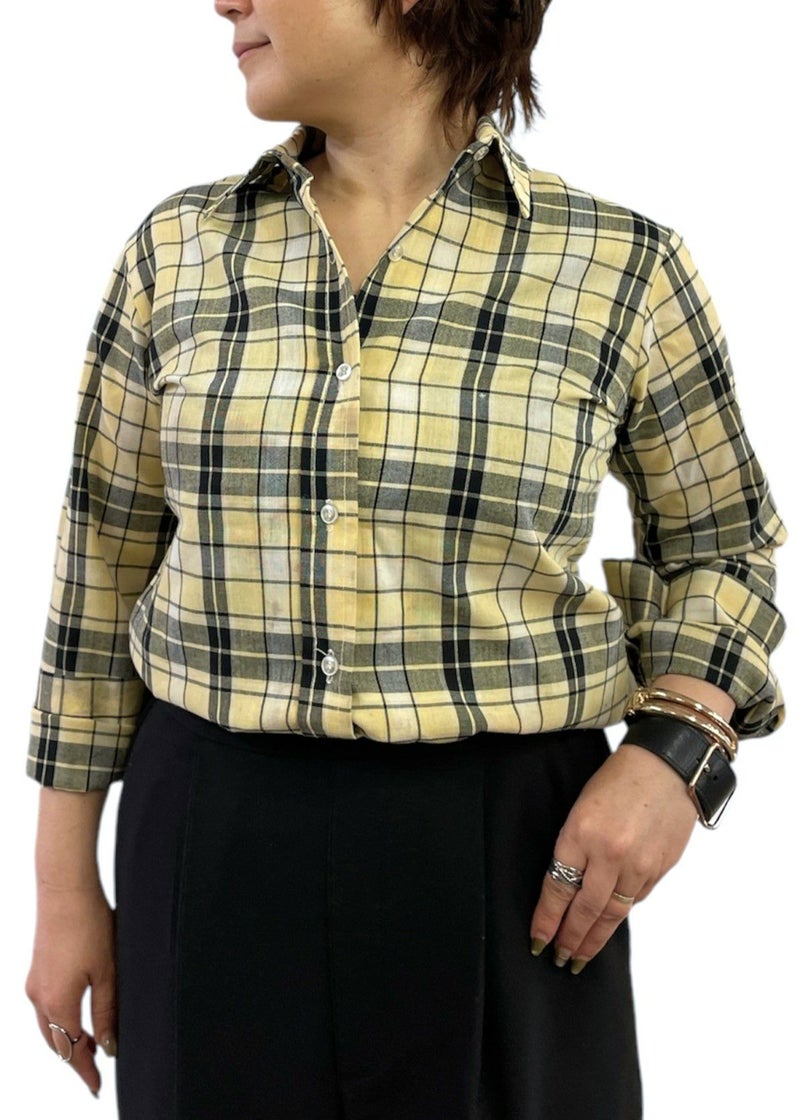 1970年代アメリカ、Lady Donlerによるヴィンテージチェックシャツ。 淡いイエローに黒を効かせた上品なチェック柄で、糊付けされたようなパリッとした素材ながらシワになりにくい。 コンパクトなタイトシルエットがクラシカルで、どこかフレンチシックな雰囲気も。 目を凝らすとほんのりとしたシミが散見されますが、それもまたヴィンテージ特有の“味”として愛おしく感じられます。