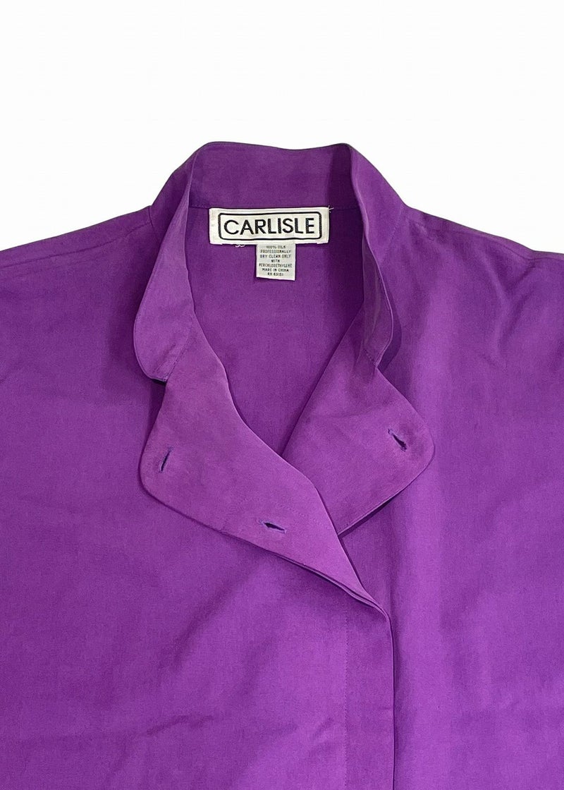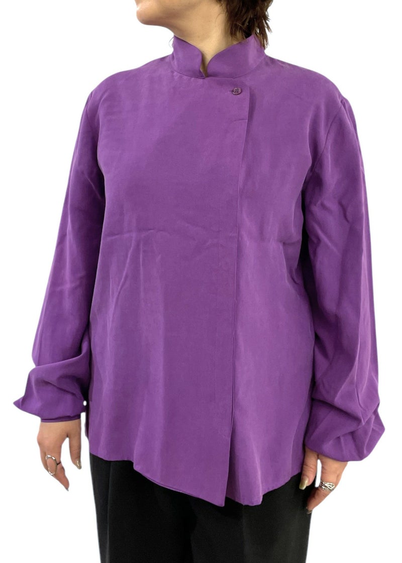 70年代USAのヴィンテージシルクシャツ。ヴィンテージならではのデザインと目を惹く鮮やかなパープルが、コーデにちょっぴり可愛さとスパイスをプラスしてくれます。 とろみのあるシルク素材は着心地も軽やかで、さらっと羽織るだけでこなれ感◎。ボタンを全部閉めてスタンドカラーにすればきちんと感、開ければゆるっとラフに。着こなしで雰囲気を変えられるのが嬉しい一枚です。 デニムやタイトスカートに合わせて、ちょいレトロなスタイルに。古着好きさんにはたまらない、可愛さと味のある一点ものです。
