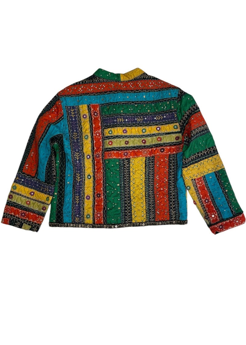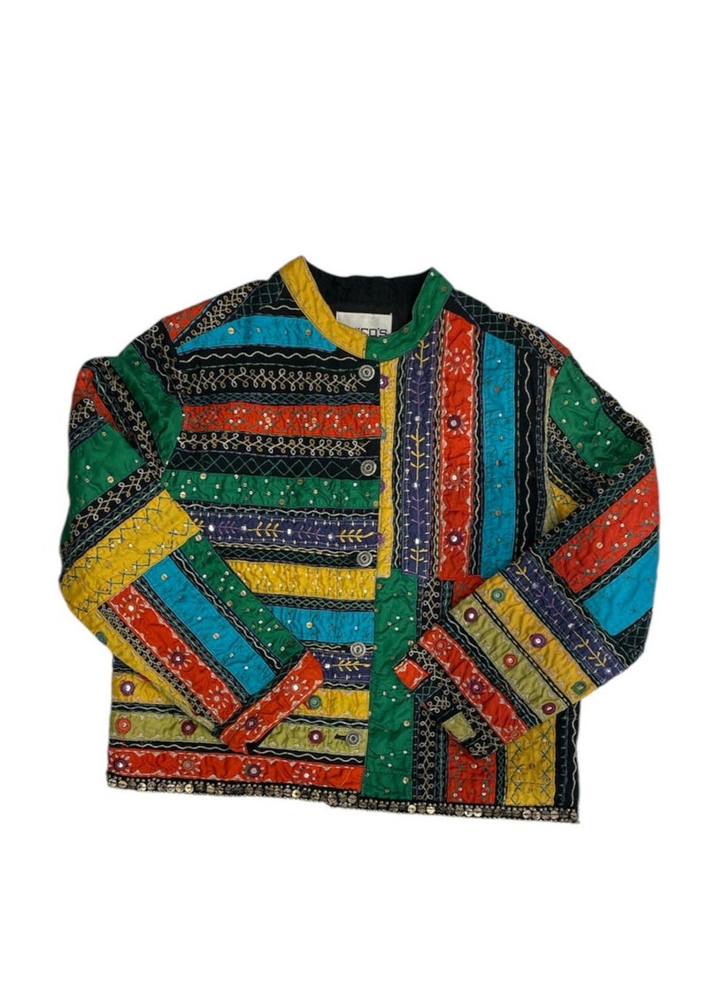 鮮やかな色彩で織り上げられたインド綿が特徴の、ノーカラーショートジャケットです。
